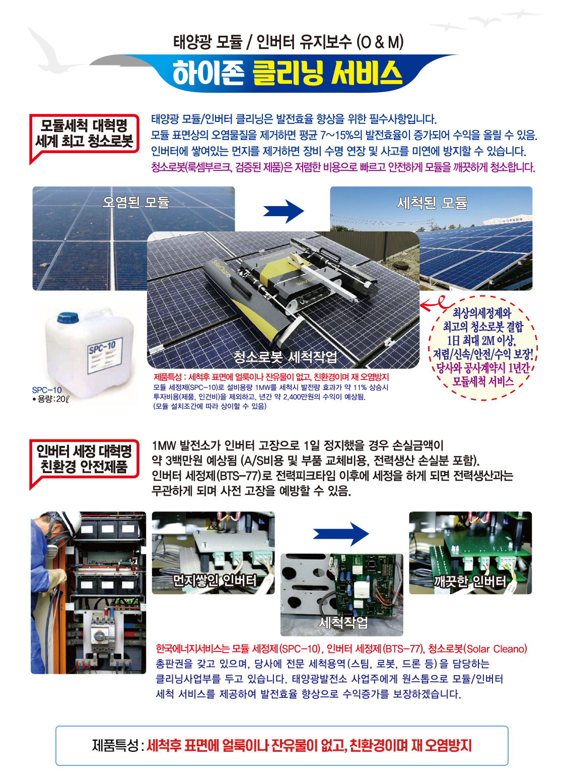 태양광 모듈 표면상의 오염물질은 발전효율을 저하시키는 요인으로서, 모듈 전용세척제와 전용장비를 사용하여 오염물질을 제거합니다.